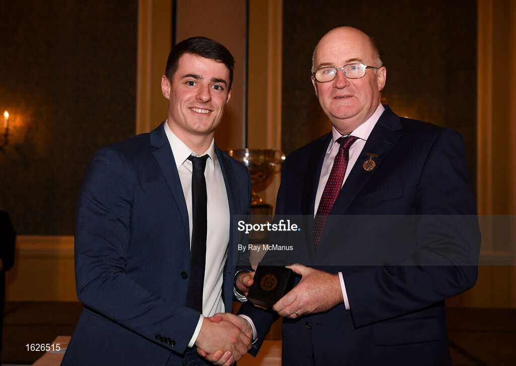 22 December 2018; Brian Howard of Dublin is presented with his GAA Football All-Ireland Senior Championship medal by Uachtarán Chumann Lúthchleas Gael John Horan at the InterContinental Dublin, Simmonscourt Road, Ballsbridge, Dublin Photo by Ray McManus/Sportsfile