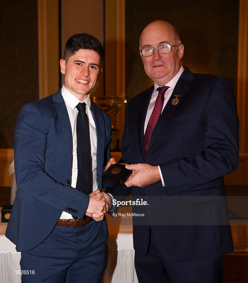 22 December 2018; Conor Mulally of Dublin is presented with his GAA Football All-Ireland Senior Championship medal by Uachtarán Chumann Lúthchleas Gael John Horan at the InterContinental Dublin, Simmonscourt Road, Ballsbridge, Dublin Photo by Ray McManus/Sportsfile