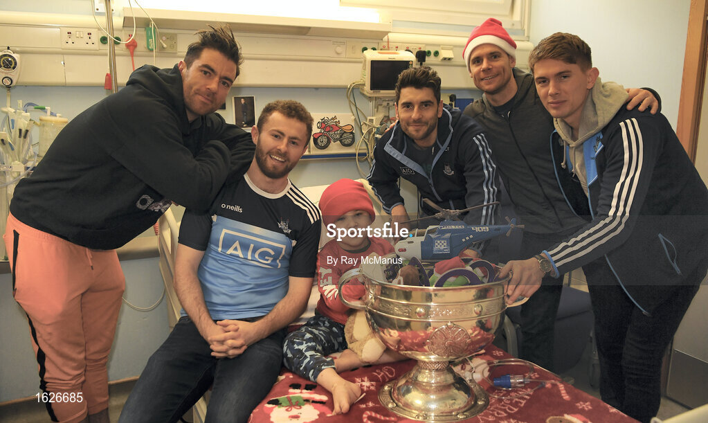25 December 2018; Michael Darragh Macauley, Jack McCaffrey, Bernard Brogan, captain Stephen Cluxton, and Michael Fitzsimons with seven year old Cormac Byrne, from Mullingar, Co Westmeath, and the Sam Maguire Cup during the Dublin Football team visit to the Children's University Hospital, Temple Street in Dublin. Photo by Ray McManus/Sportsfile