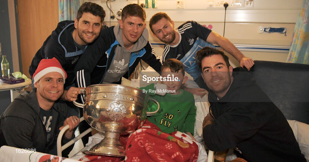 25 December 2018; Captain Stephen Cluxton, Bernard Brogan, Michael Fitzsimons, Jack McCaffrey and Michael Darragh Macauley, with eight year old Ross Duffy, from Coolock, Dublin, and the Sam Maguire Cup during the Dublin Football team visit to the Children's University Hospital, Temple Street in Dublin. Photo by Ray McManus/Sportsfile