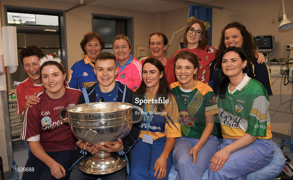 25 December 2018; Eoin Murchan with staff on duty in the A and E department, Imenda Farren, Loughrea, Co Galway, Anne Marie McGuire, Kilmurry Ibrickane, Clare, Kiera Byrne, Ardcath, Meath, Ruth Dunne, Birr, Offaly, Hannagh O'Farrel, Cork, Anne Lynch, Longford, Maeve O'Sullivan, Clonmel, Tipperary, Alice Griffin, Ballybofey, Donegal, Lyndsey Singleton, Donamede, Dublin, and Orla O'Farrell, Edgeworthstown, Longford, and the Sam Maguire Cup during the Dublin Football team visit to Beaumont Hospital in Dublin. Photo by Ray McManus/Sportsfile