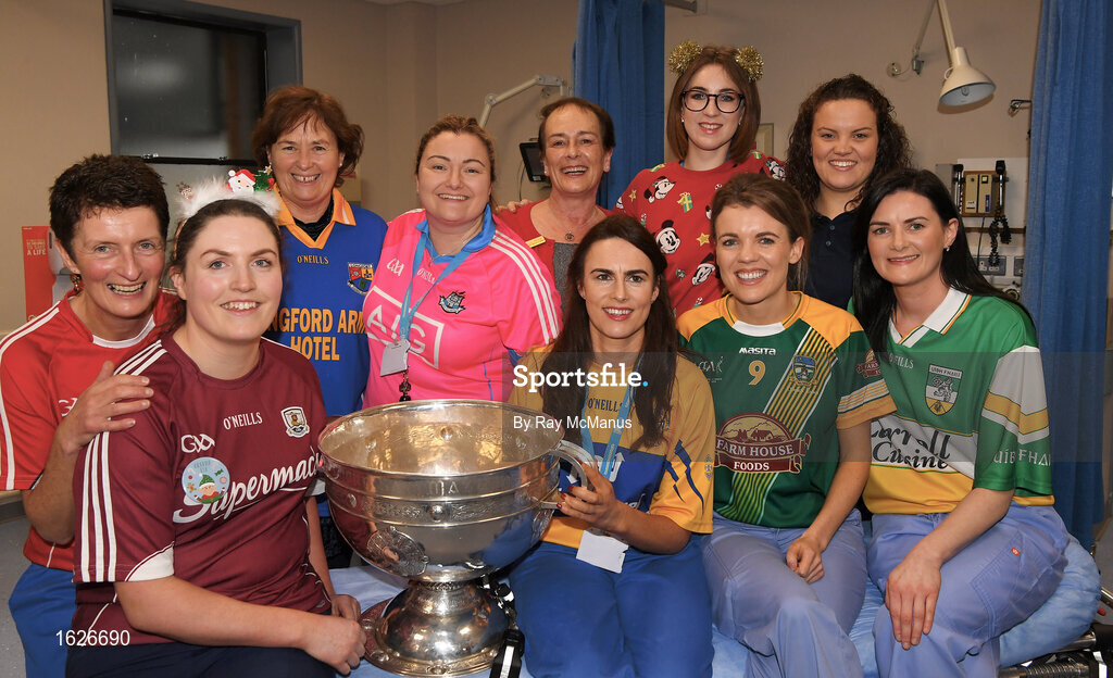 25 December 2018; Staff on duty in the A and E department, Imenda Farren, Loughrea, Co Galway, Anne Marie McGuire, Kilmurry Ibrickane, Clare, Kiera Byrne, Ardcath, Meath, Ruth Dunne, Birr, Offaly, Hannagh O'Farrel, Cork, Anne Lynch, Longford, Maeve O'Sullivan, Clonmel, Tipperary, Alice Griffin, Ballybophey, Donegal, Lyndsey Singleton, Donamede, Dublin, and Orla O'Farrell,, Edgeworthstown, Longford, and the Sam Maguire Cup during the Dublin Football team visit to Beaumont Hospital in Dublin. Photo by Ray McManus/Sportsfile