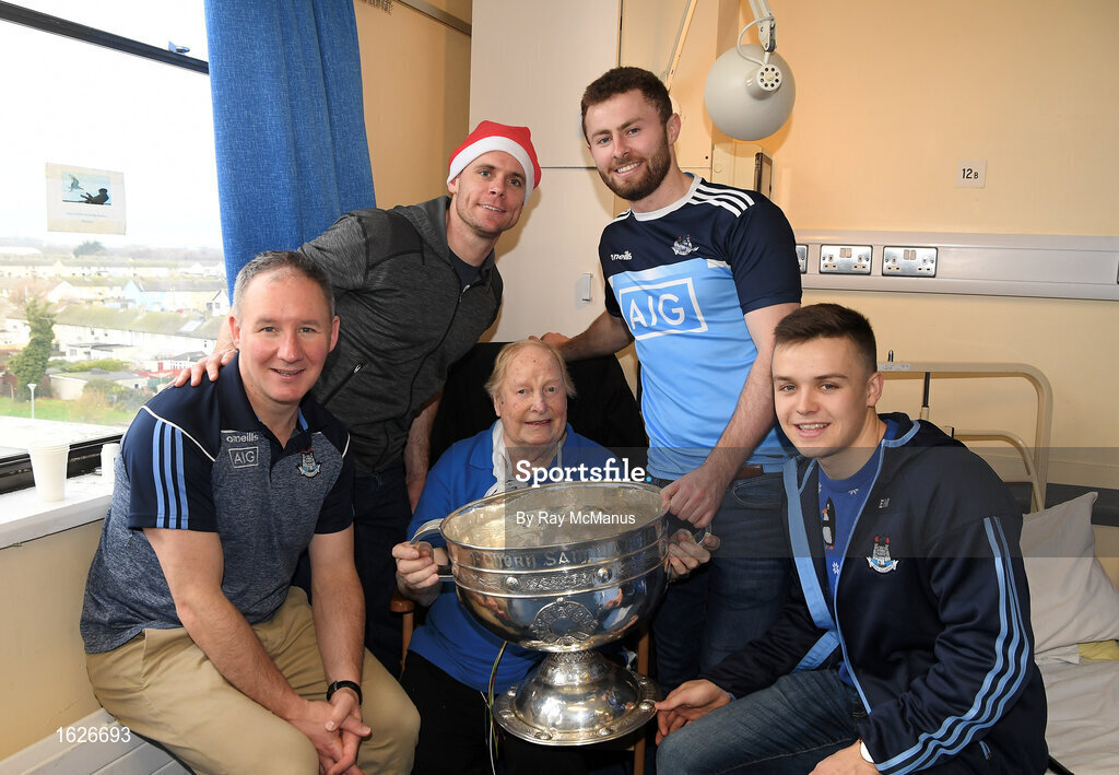 25 December 2018; Manager Jim Gavin, captain Stephen Cluxton, Jack McCaffrey, Eoin Murchan, patient Laurence Shannon, from Portmarnock, and the Sam Maguire Cup during the Dublin Football team visit to Beaumont Hospital in Dublin. Photo by Ray McManus/Sportsfile