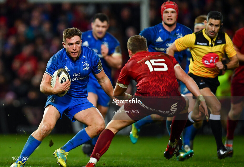 29 December 2018; Jordan Larmour of Leinster in action against Mike Haley of Munster during the Guinness PRO14 Round 12 match between Munster and Leinster at Thomond Park in Limerick. Photo by Ramsey Cardy/Sportsfile