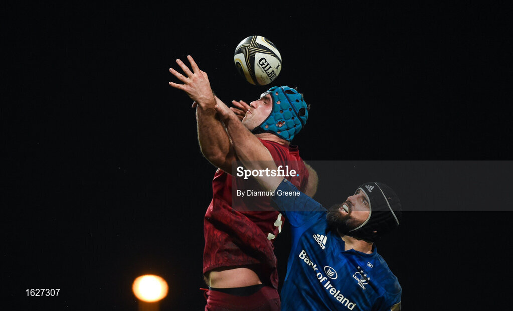 29 December 2018; Tadhg Beirne of Munster contests a lineout with Scott Fardy of Leinster during the Guinness PRO14 Round 12 match between Munster and Leinster at Thomond Park in Limerick. Photo by Diarmuid Greene/Sportsfile