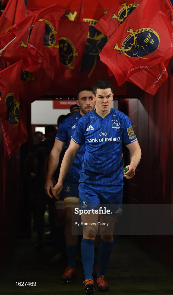 29 December 2018; Leinster captain Jonathan Sexton leads his side out ahead of the Guinness PRO14 Round 12 match between Munster and Leinster at Thomond Park in Limerick. Photo by Ramsey Cardy/Sportsfile