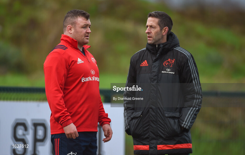 31 December 2018; Dave Kilcoyne in conversation with strength and conditioning coach Aidan O'Connell during Munster Rugby squad training at the University of Limerick in Limerick. Photo by Diarmuid Greene/Sportsfile