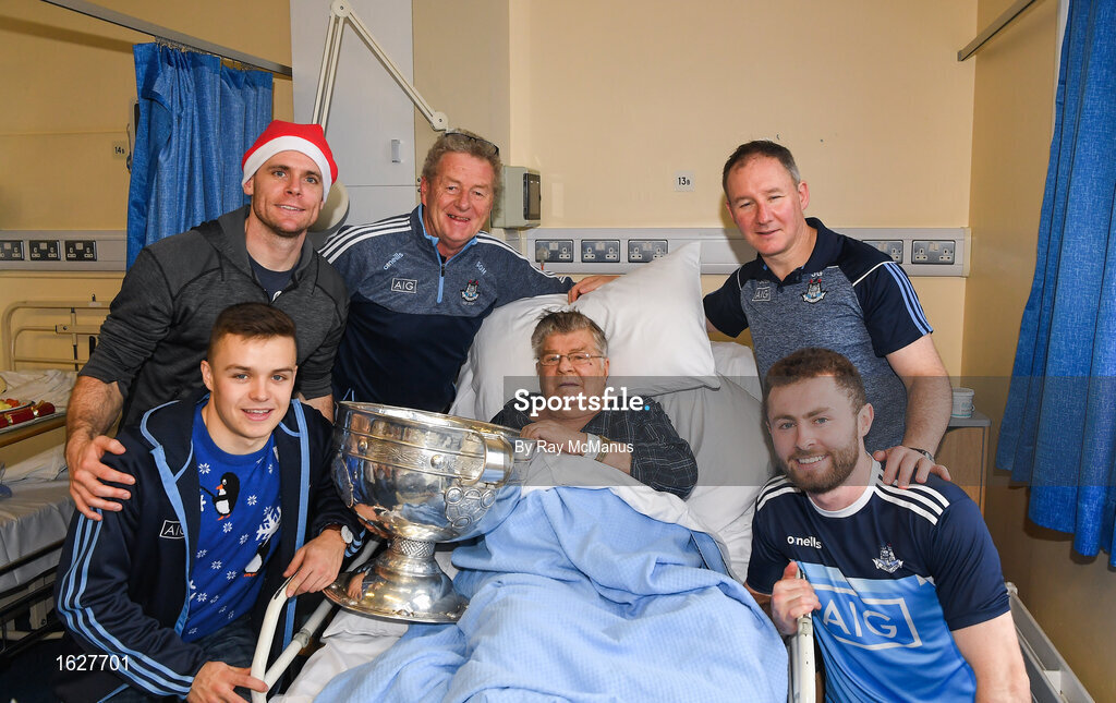25 December 2018; Captain Stephen Cluxton, manager Jim Gavin, Jack McCaffrey, Eoin Murchan, patient Sean Lynch, from Sutton, Dublin, and the Sam Maguire Cup during the Dublin Football team visit to Beaumont Hospital in Dublin. Photo by Ray McManus/Sportsfile
