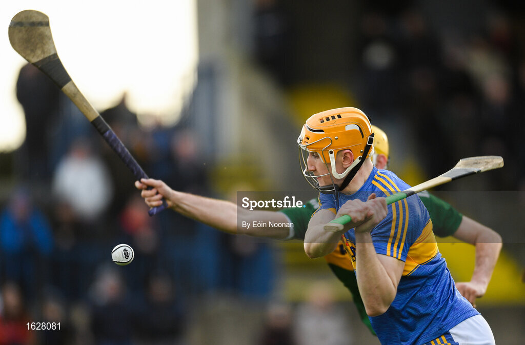 5 January 2019; Mark Kehoe of Tipperary has a shot on goal despite the attention of John Buckley of Kerry during the Co-Op Superstores Munster Hurling League 2019 match between Tipperary and Kerry at MacDonagh Park in Nenagh, Co. Tipperary. Photo by Eóin Noonan/Sportsfile