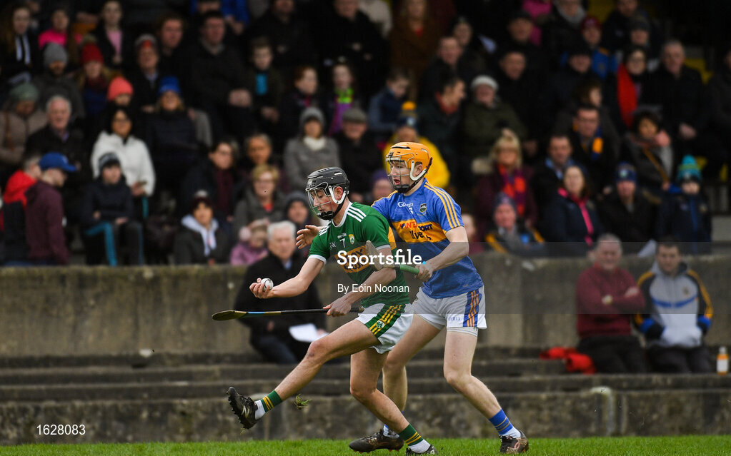 5 January 2019; Tomás O'Connor of Kerry in action against Alan Flynn of Tipperary during the Co-Op Superstores Munster Hurling League 2019 match between Tipperary and Kerry at MacDonagh Park in Nenagh, Co. Tipperary. Photo by Eóin Noonan/Sportsfile