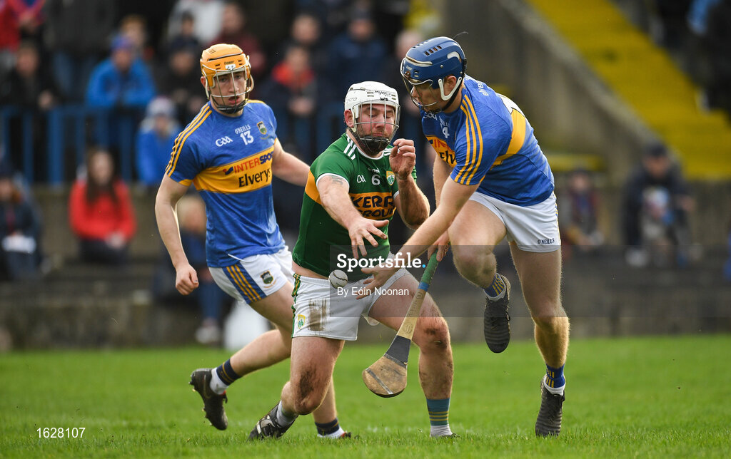 5 January 2019; Jason Forde of Tipperary is tackled by Mikey Boyle of Kerry during the Co-Op Superstores Munster Hurling League 2019 match between Tipperary and Kerry at MacDonagh Park in Nenagh, Co. Tipperary. Photo by Eóin Noonan/Sportsfile