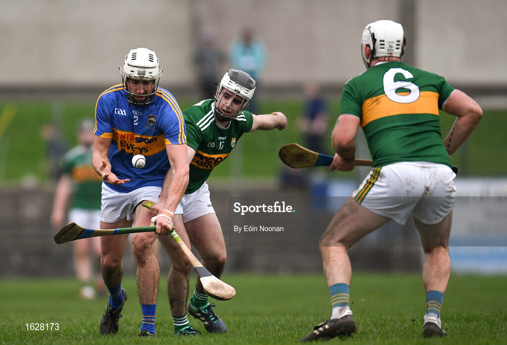 5 January 2019; Patrick Maher of Tipperary is tackled by Jack Goulding of Kerry during the Co-Op Superstores Munster Hurling League 2019 match between Tipperary and Kerry at MacDonagh Park in Nenagh, Co. Tipperary. Photo by Eóin Noonan/Sportsfile