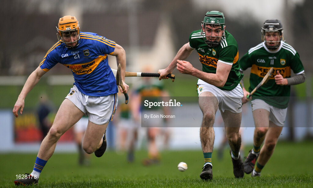 5 January 2019; Cian Darcy of Tipperary in action against Eric Leen of Kerry during the Co-Op Superstores Munster Hurling League 2019 match between Tipperary and Kerry at MacDonagh Park in Nenagh, Co. Tipperary. Photo by Eóin Noonan/Sportsfile