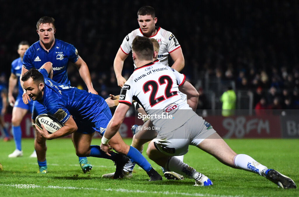 5 January 2019; Jamison Gibson-Park of Leinster evades the tackle of Bruce Houston of Ulster as he goes over to score his side's fifth try during the Guinness PRO14 Round 13 match between Leinster and Ulster at the RDS Arena in Dublin. Photo by Seb Daly/Sportsfile