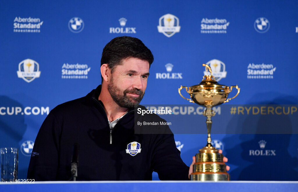 8 January 2019; Padraig Harrington of Ireland with the Ryder Cup trophy during a press conference where he was announced as European Ryder Cup Captain for the 2020 Ryder Cup matches which take place at Whistling Straits, USA, at the Wentworth Club in Surrey, England. Photo by Brendan Moran/Sportsfile