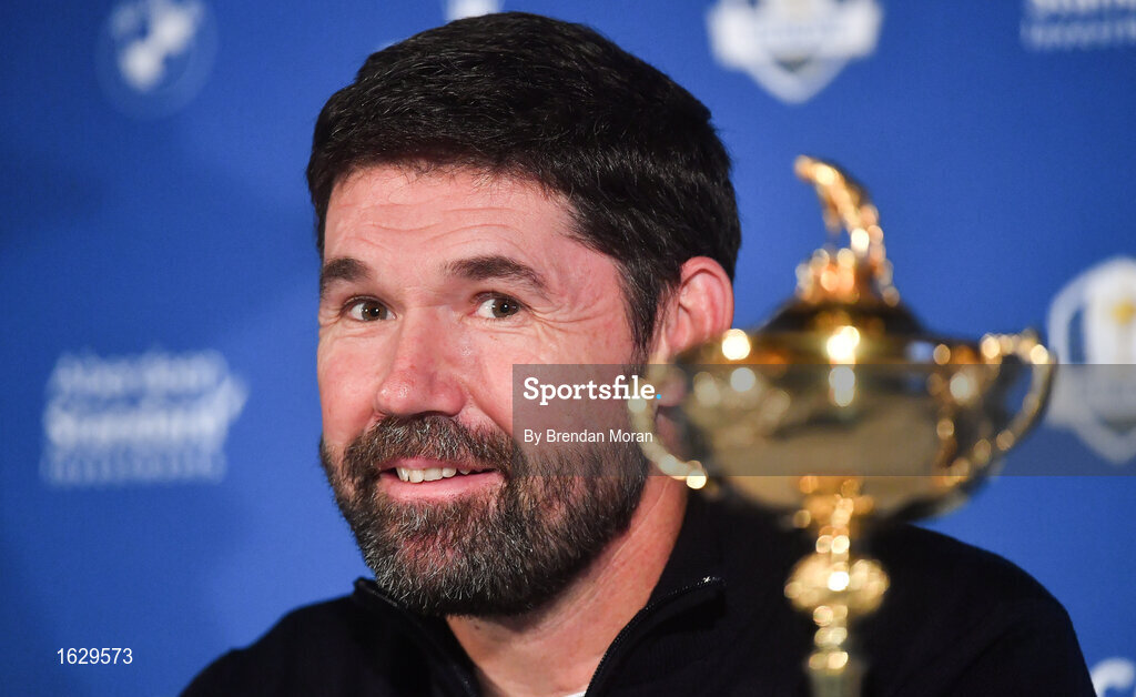 8 January 2019; Padraig Harrington of Ireland with the Ryder Cup trophy during a press conference where he was announced as European Ryder Cup Captain for the 2020 Ryder Cup matches which take place at Whistling Straits, USA, at the Wentworth Club in Surrey, England. Photo by Brendan Moran/Sportsfile