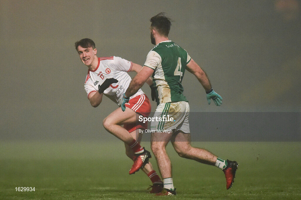 9 January 2019; Darragh Canavan of Tyrone being pushed by Kane Connor of Fermanagh after coming on as a scond half sub during the Bank of Ireland Dr McKenna Cup Round 3 match between Tyrone and Fermanagh at Healy Park in Omagh, Tyrone. Photo by Oliver McVeigh/Sportsfile