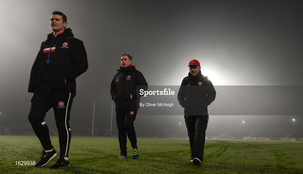 9 January 2019; Tyrone manager Mickey Harte, right,with Peter Donnelly Tyrone strngth and conditioning coach, left, and assistant manager Gavin Devlin on the pitch before the Bank of Ireland Dr McKenna Cup Round 3 match between Tyrone and Fermanagh at Healy Park in Omagh, Tyrone. Photo by Oliver McVeigh/Sportsfile