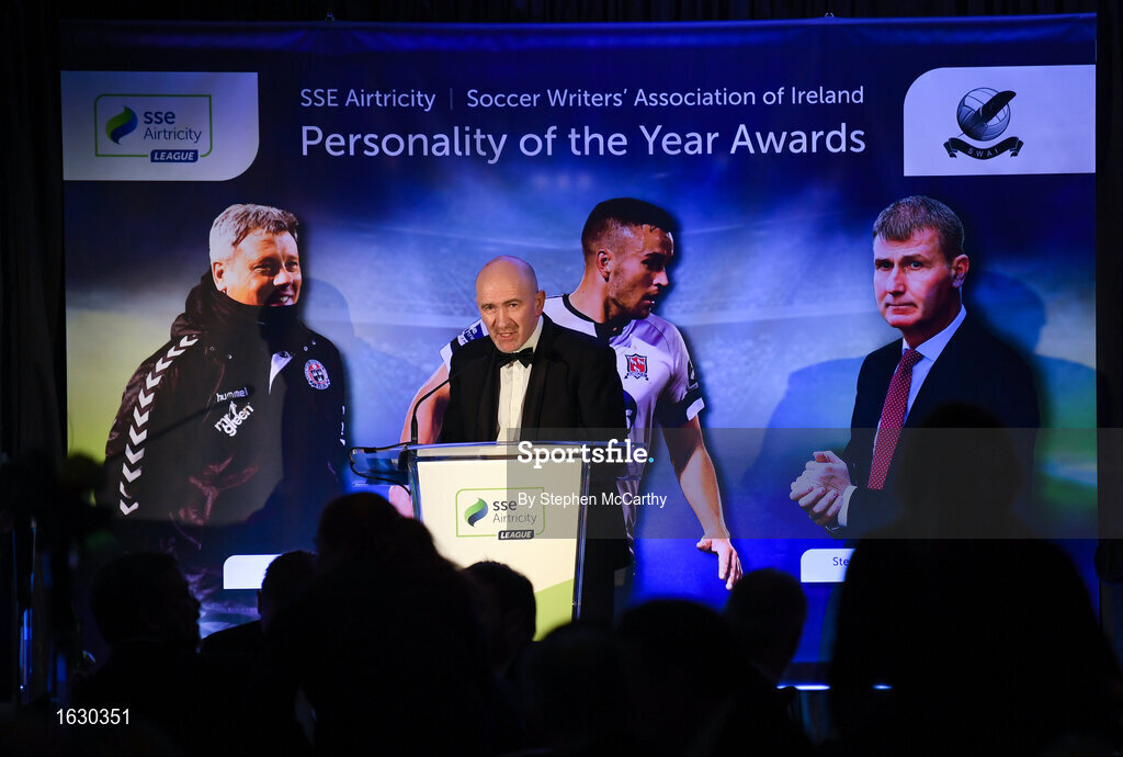 11 January 2019; SWAI President Philip Quinn speaking during the SSE Airtricity Soccer Writers’ Association of Ireland Awards 2018 at the Conrad Hotel in Dublin. Photo by Stephen McCarthy/Sportsfile