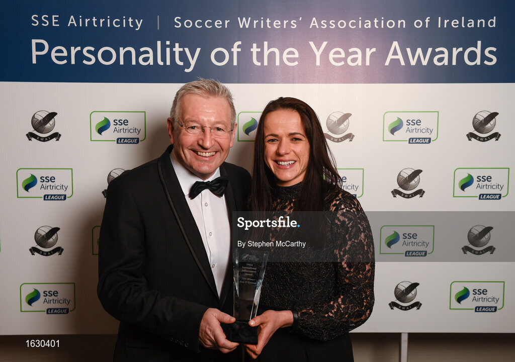 11 January 2019; Former Republic of Ireland international Áine O'Gorman with her Special Achievement award and Tony O'Donoghue during the SSE Airtricity Soccer Writers’ Association of Ireland Awards 2018 at the Conrad Hotel in Dublin. Photo by Stephen McCarthy/Sportsfile