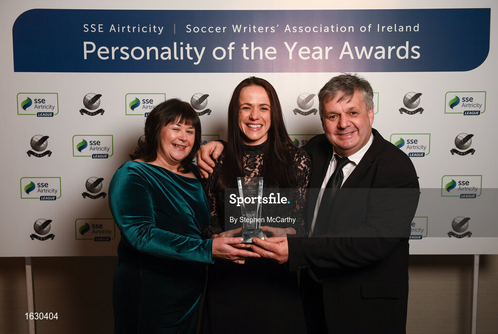 11 January 2019; Former Republic of Ireland international Áine O'Gorman with her Special Achievement award and parents Mairead and Jimmy during the SSE Airtricity Soccer Writers’ Association of Ireland Awards 2018 at the Conrad Hotel in Dublin. Photo by Stephen McCarthy/Sportsfile