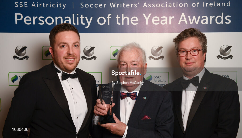 11 January 2019; Drogheda United's Vincent Hoey who was presented with the Liam Tuohy Special Merit Award and his son's Fran, left, and Conor, right, during the SSE Airtricity Soccer Writers’ Association of Ireland Awards 2018 at the Conrad Hotel in Dublin. Photo by Stephen McCarthy/Sportsfile