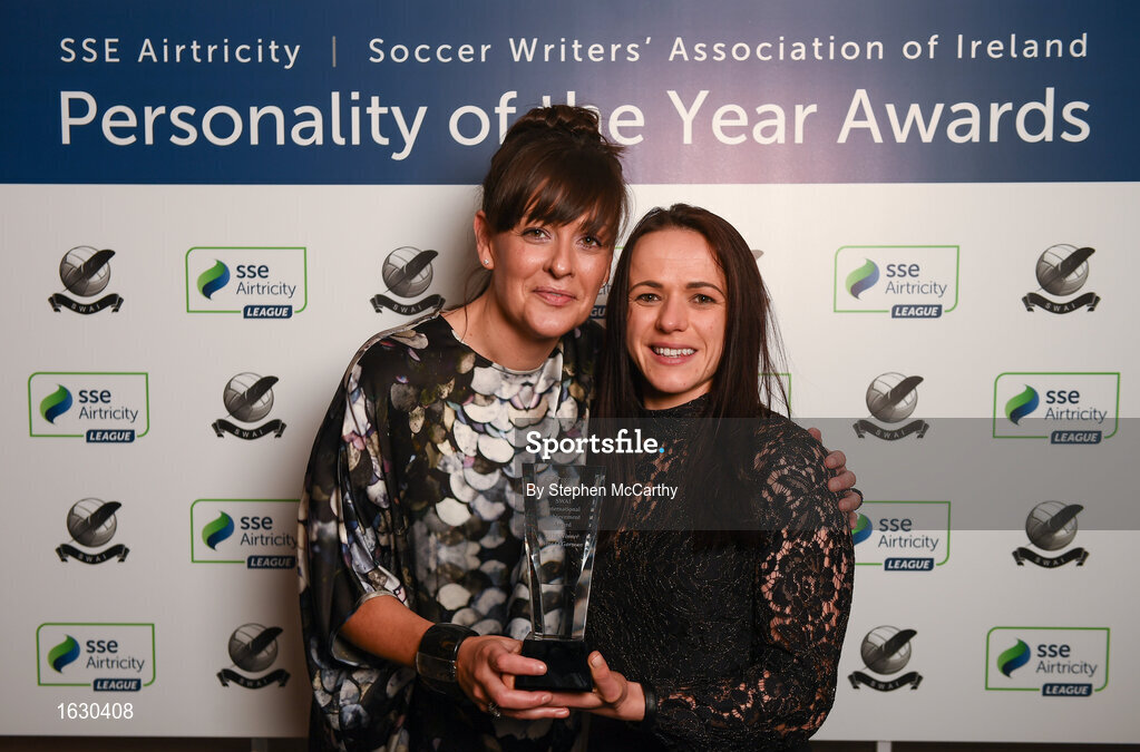 11 January 2019; Former Republic of Ireland international Áine O'Gorman is presented with her Special Achievement award by Victoria Groom, Head of Marketing, SSE Airtricity, during the SSE Airtricity Soccer Writers’ Association of Ireland Awards 2018 at the Conrad Hotel in Dublin. Photo by Stephen McCarthy/Sportsfile