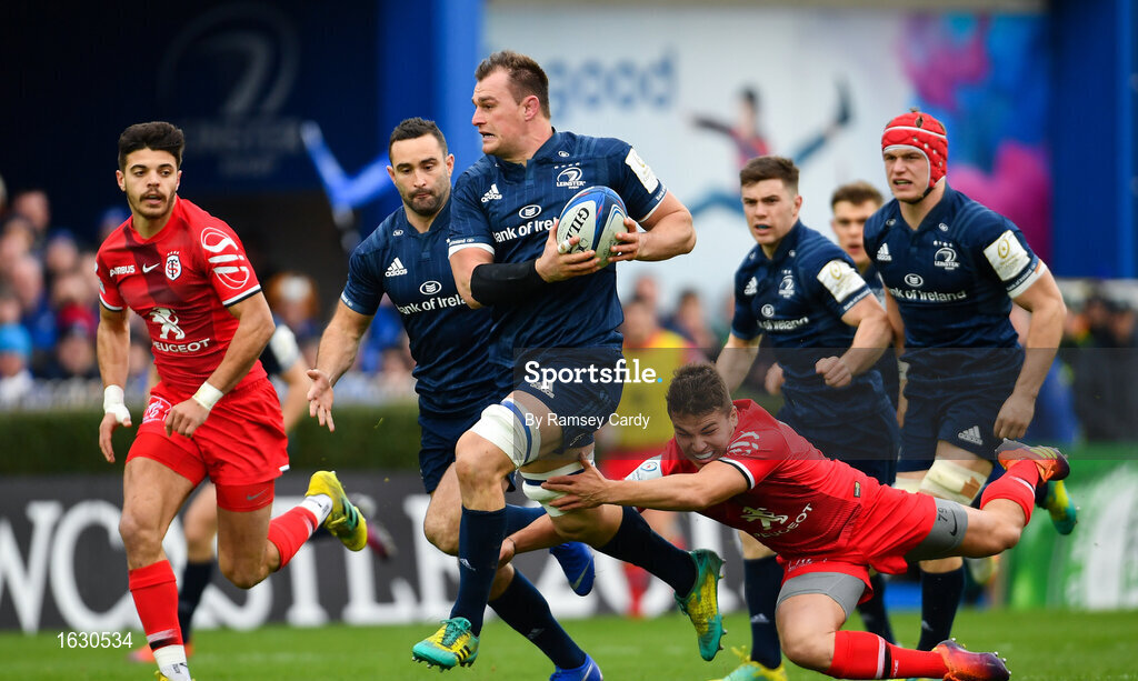 12 January 2019; Rhys Ruddock of Leinster is tackled by Antoine Dupont of Toulouse during the Heineken Champions Cup Pool 1 Round 5 match between Leinster and Toulouse at the RDS Arena in Dublin. Photo by Ramsey Cardy/Sportsfile