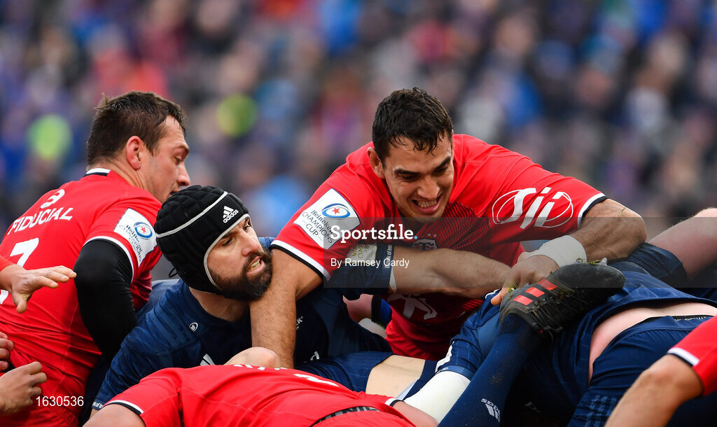 12 January 2019; Scott Fardy of Leinster in action against Richie Arnold of Toulouse during the Heineken Champions Cup Pool 1 Round 5 match between Leinster and Toulouse at the RDS Arena in Dublin. Photo by Ramsey Cardy/Sportsfile