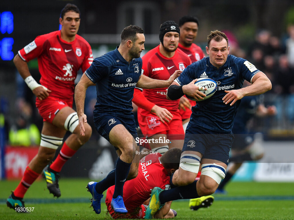 12 January 2019; Rhys Ruddock of Leinster, right, is tackled by Antoine Dupont of Toulouse during the Heineken Champions Cup Pool 1 Round 5 match between Leinster and Toulouse at the RDS Arena in Dublin. Photo by Seb Daly/Sportsfile