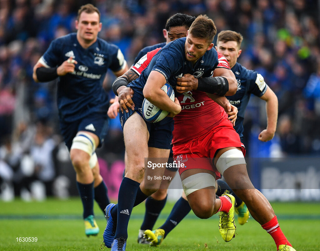 12 January 2019; Ross Byrne of Leinster is tackled by Joe Tekori of Toulouse during the Heineken Champions Cup Pool 1 Round 5 match between Leinster and Toulouse at the RDS Arena in Dublin. Photo by Seb Daly/Sportsfile