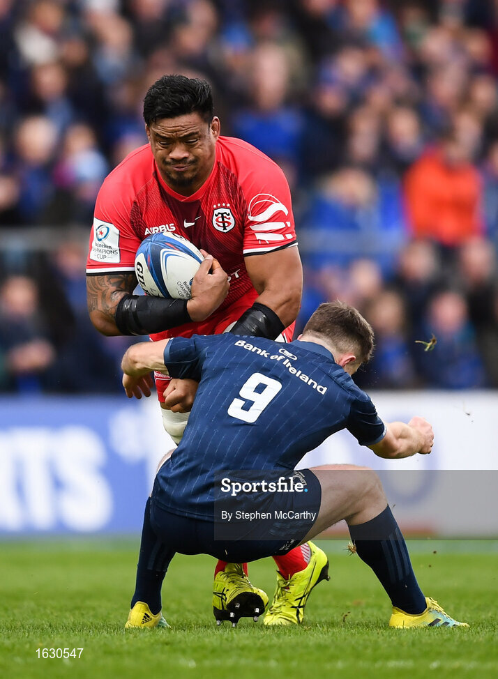 12 January 2019; Joe Tekori of Toulouse is tackled by Luke McGrath of Leinster during the Heineken Champions Cup Pool 1 Round 5 match between Leinster and Toulouse at the RDS Arena in Dublin. Photo by Stephen McCarthy/Sportsfile