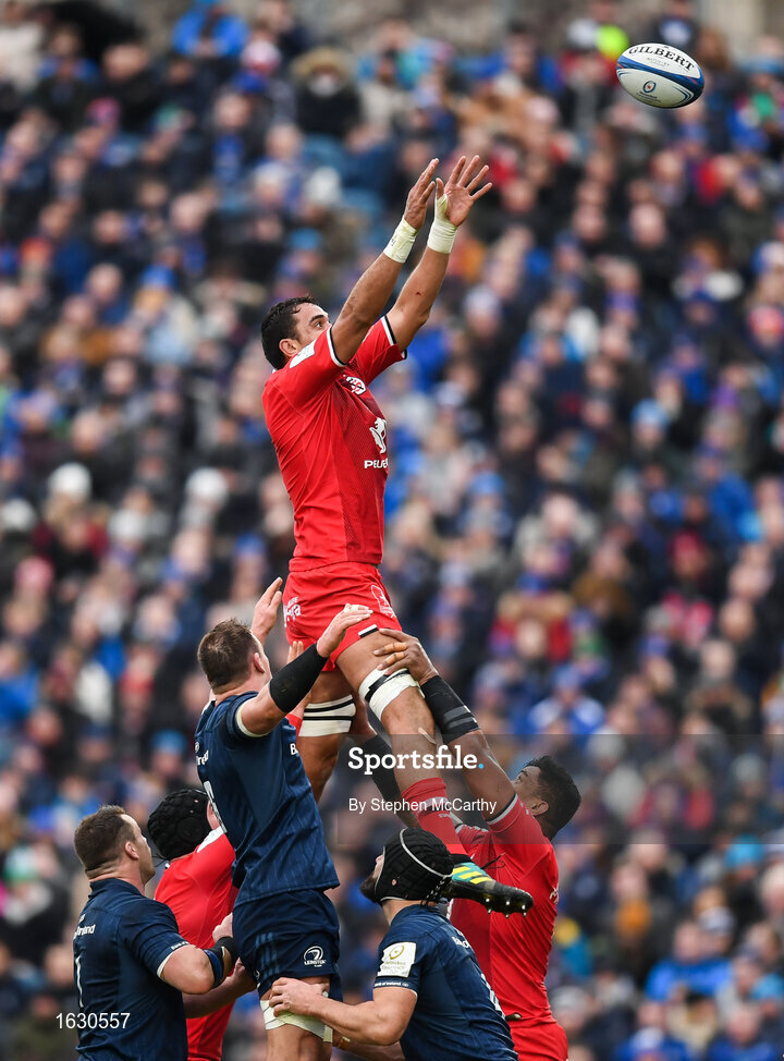 12 January 2019; Richie Arnold of Toulouse wins possession in the lineout during the Heineken Champions Cup Pool 1 Round 5 match between Leinster and Toulouse at the RDS Arena in Dublin. Photo by Stephen McCarthy/Sportsfile