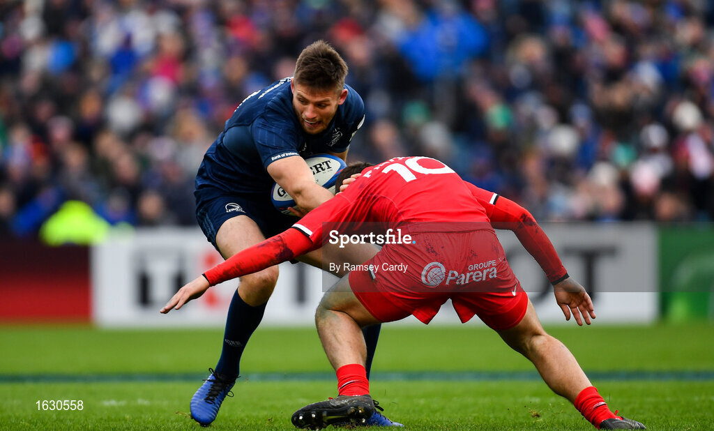 12 January 2019; Ross Byrne of Leinster is tackled by Thomas Ramos of Toulouse during the Heineken Champions Cup Pool 1 Round 5 match between Leinster and Toulouse at the RDS Arena in Dublin. Photo by Ramsey Cardy/Sportsfile