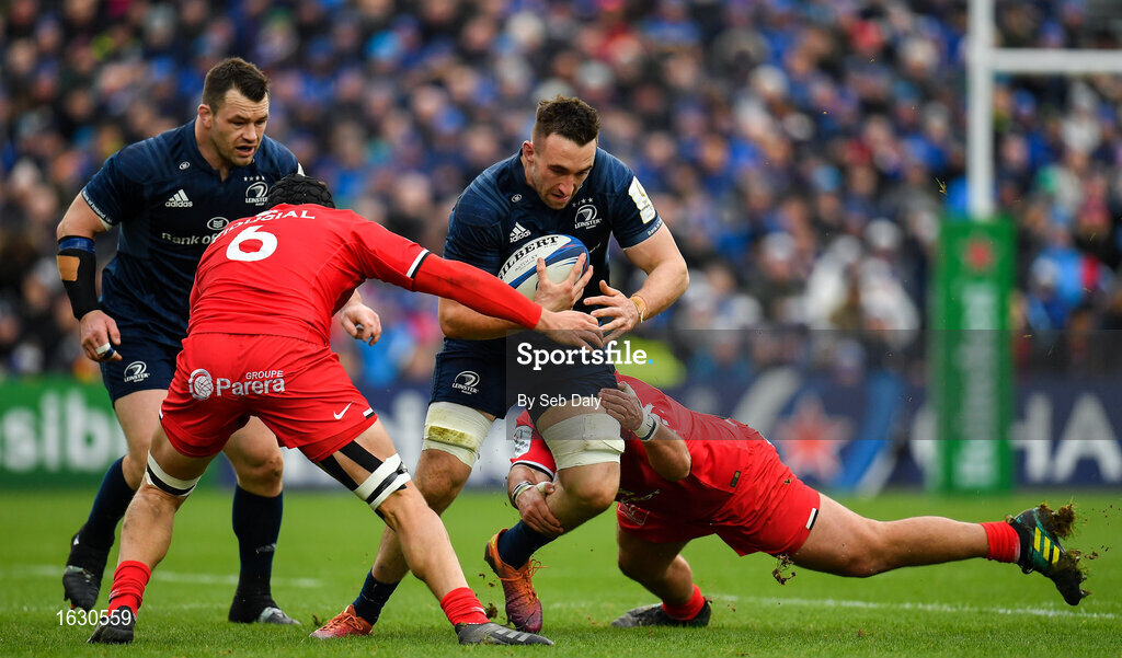 12 January 2019; Jack Conan of Leinster is tackled by Francois Cros, left, and Rynhardt Elstadt of Toulouse during the Heineken Champions Cup Pool 1 Round 5 match between Leinster and Toulouse at the RDS Arena in Dublin. Photo by Seb Daly/Sportsfile