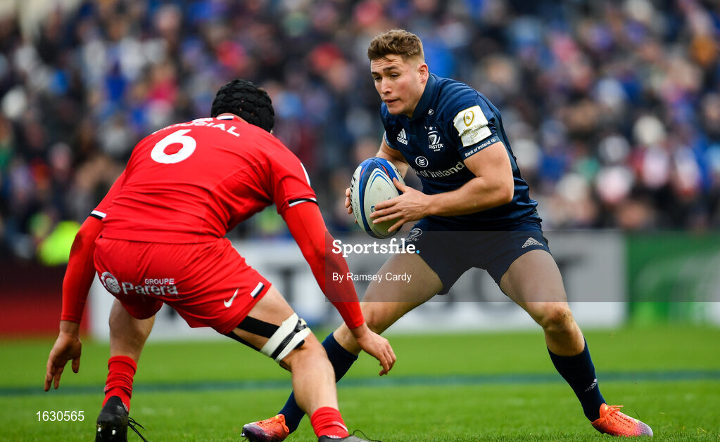 12 January 2019; Jordan Larmour of Leinster in action against Francois Cros of Toulouse during the Heineken Champions Cup Pool 1 Round 5 match between Leinster and Toulouse at the RDS Arena in Dublin. Photo by Ramsey Cardy/Sportsfile