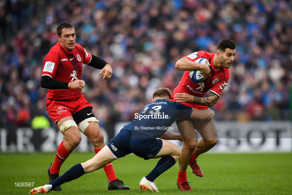 12 January 2019; Sofiane Guitoune of Toulouse is tackled by Garry Ringrose of Leinster during the Heineken Champions Cup Pool 1 Round 5 match between Leinster and Toulouse at the RDS Arena in Dublin. Photo by Stephen McCarthy/Sportsfile