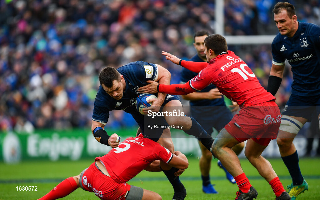 12 January 2019; Cian Healy of Leinster is tackled by Antoine Dupont, left, and Thomas Ramos of Toulouse during the Heineken Champions Cup Pool 1 Round 5 match between Leinster and Toulouse at the RDS Arena in Dublin. Photo by Ramsey Cardy/Sportsfile
