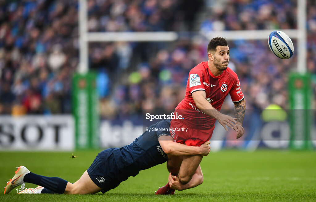 12 January 2019; Sofiane Guitoune of Toulouse is tackled by Garry Ringrose of Leinster during the Heineken Champions Cup Pool 1 Round 5 match between Leinster and Toulouse at the RDS Arena in Dublin. Photo by Stephen McCarthy/Sportsfile
