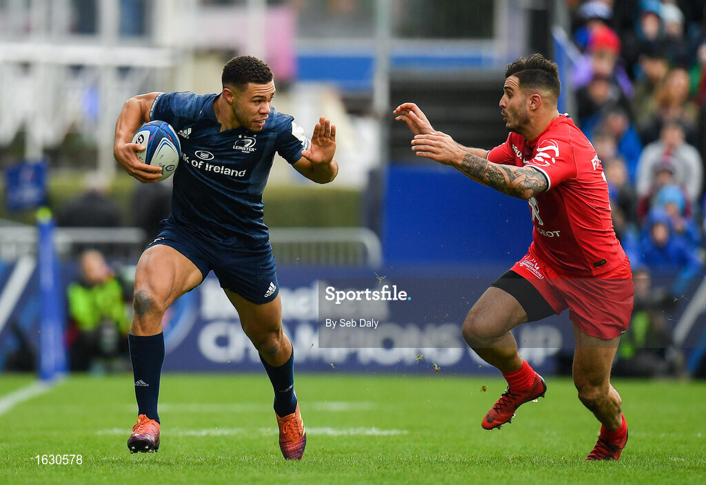 12 January 2019; Adam Byrne of Leinster in action against Sofiane Guitoune of Toulouse during the Heineken Champions Cup Pool 1 Round 5 match between Leinster and Toulouse at the RDS Arena in Dublin. Photo by Seb Daly/Sportsfile