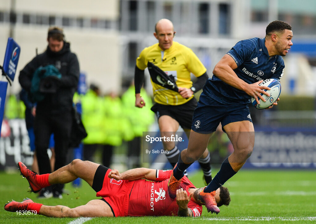12 January 2019; Adam Byrne of Leinster evades the tackle of Sofiane Guitoune of Toulouse during the Heineken Champions Cup Pool 1 Round 5 match between Leinster and Toulouse at the RDS Arena in Dublin. Photo by Seb Daly/Sportsfile