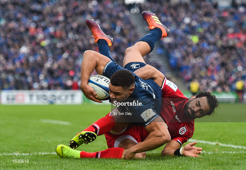 12 January 2019; Adam Byrne of Leinster is tackled by Yoann Huget of Toulouse during the Heineken Champions Cup Pool 1 Round 5 match between Leinster and Toulouse at the RDS Arena in Dublin. Photo by Seb Daly/Sportsfile