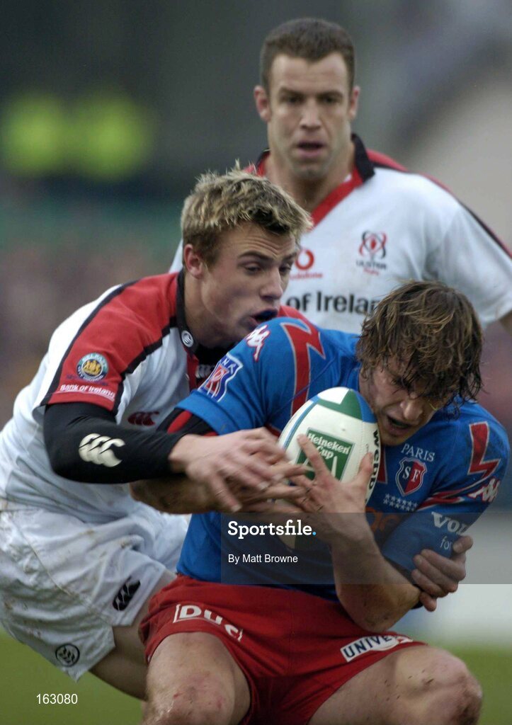 11 December 2004; Micro Bergamasco, Stade Francais, is tackled by Tommy Bowe, Ulster. Heineken European Cup 2004-2005, Pool 6, Round 4, Ulster v Stade Francais, Ravenhill, Belfast. Picture credit; Matt Browne / SPORTSFILE