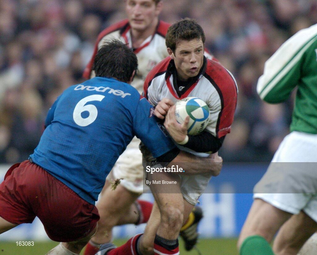 11 December 2004; Bryn Cunningham, Ulster, is tackled by Poerre Martin, Stade Francais. Heineken European Cup 2004-2005, Pool 6, Round 4, Ulster v Stade Francais, Ravenhill, Belfast. Picture credit; Matt Browne / SPORTSFILE