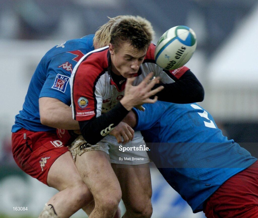 11 December 2004; Tommy Bowe, Ulster, is tackled by Remy Martin, left and Pablo Lemonine, Stade Francais. Heineken European Cup 2004-2005, Pool 6, Round 4, Ulster v Stade Francais, Ravenhill, Belfast. Picture credit; Matt Browne / SPORTSFILE