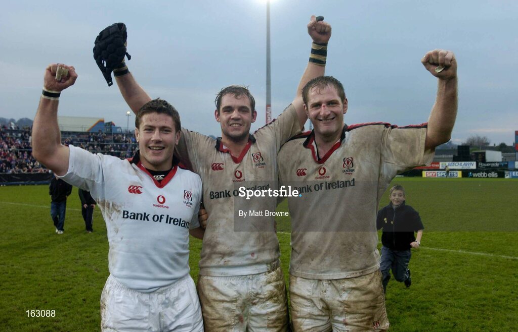 11 December 2004; Ulster players, left to right, Bryan Young, Matt McCullough and Gary Longwell celebrate after the match. Heineken European Cup 2004-2005, Pool 6, Round 4, Ulster v Stade Francais, Ravenhill, Belfast. Picture credit; Matt Browne / SPORTSFILE