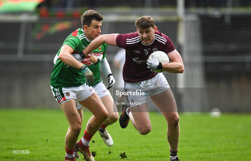 13 January 2019; Thomas Flynn of Galway in action against Jason Doherty of Mayo during the Connacht FBD League semi-final match between Galway and Mayo at Tuam Stadium in Galway. Photo by Harry Murphy/Sportsfile