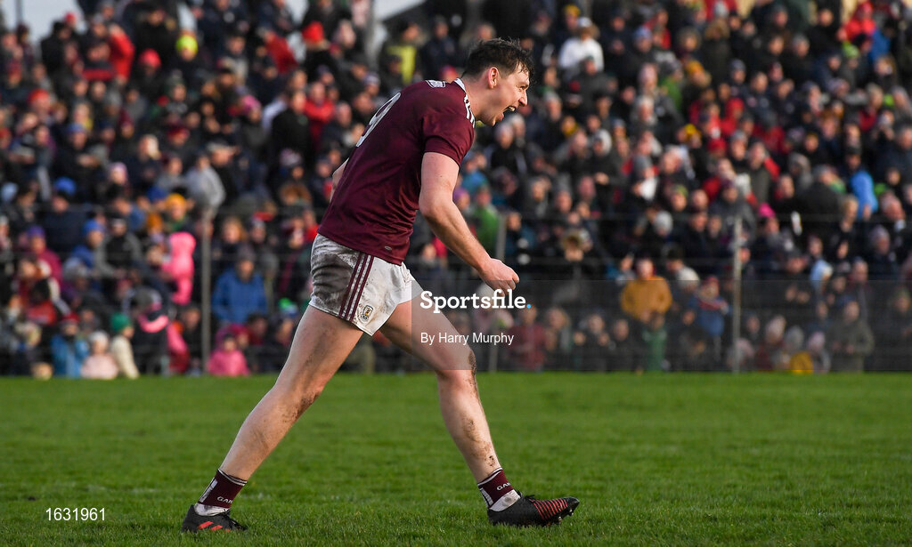 13 January 2019; Thomas Flynn of Galway celebrates scoring the winning penalty following the Connacht FBD League semi-final match between Galway and Mayo at Tuam Stadium in Galway. Photo by Harry Murphy/Sportsfile
