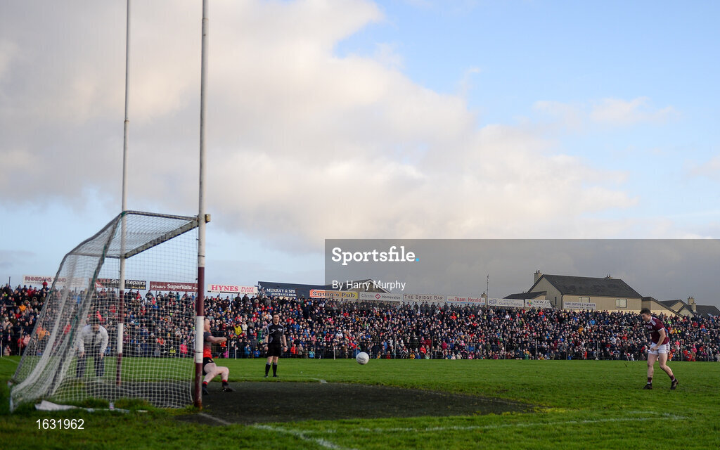 13 January 2019; A general view as Johnny Heaney of Galway takes a penalty during the penalty shoot-out during the Connacht FBD League semi-final match between Galway and Mayo at Tuam Stadium in Galway. Photo by Harry Murphy/Sportsfile