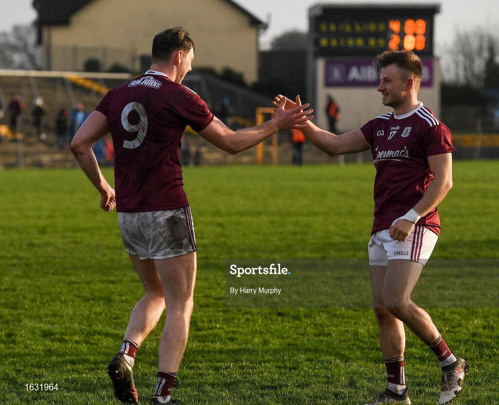 13 January 2019; Thomas Flynn is congratulated for scoring the winning penalty by Eoghan Kerin of Galway following the Connacht FBD League semi-final match between Galway and Mayo at Tuam Stadium in Galway. Photo by Harry Murphy/Sportsfile